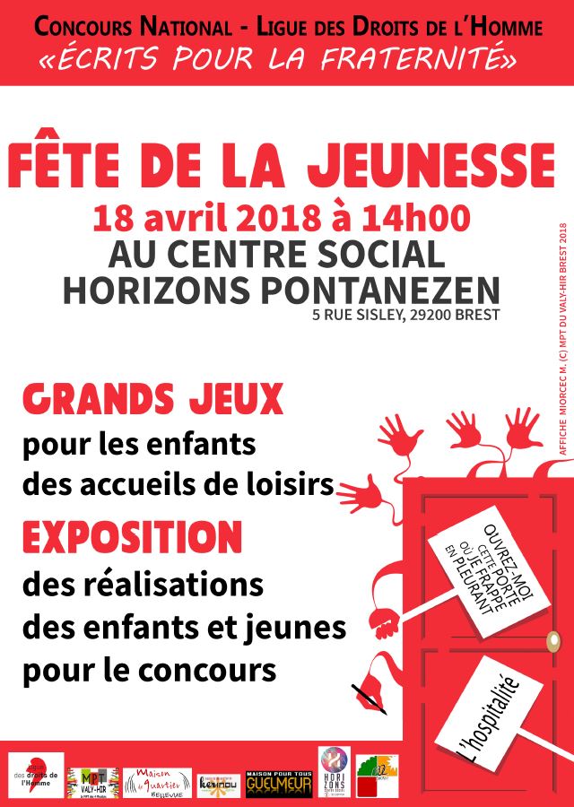 Nous avons le plaisir d’accueillir la Fête de la Jeunesse co-organisé par des équipements de quartier Brestois et par la Ligue des Droits de l’Homme. Cette journée proposera des grands jeux pour les enfants des accueils de loisirs et une exposition des réalisations des enfants et des jeunes pour le concours « Ecrits pour la Fraternité ».