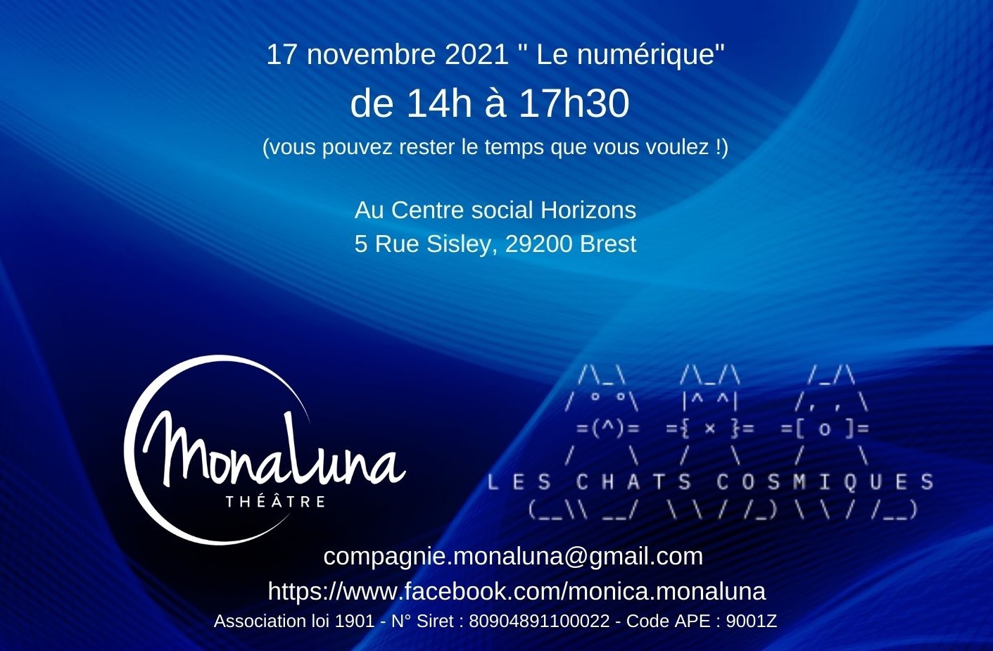 Mercredi 27 novembre 2021 de 14h à 17h30, le Centre Social accueille l’Acte IV des Chantiers « Art interactif » de Monica Campo Hurtado (Compagnie Monaluna). Ouvert à toutes et à tous, Monica vous propose de découvrir la thématique du numérique à travers différents angles, via des scènes, jeux, débats, … et avec la participation de nombreux intervenants !