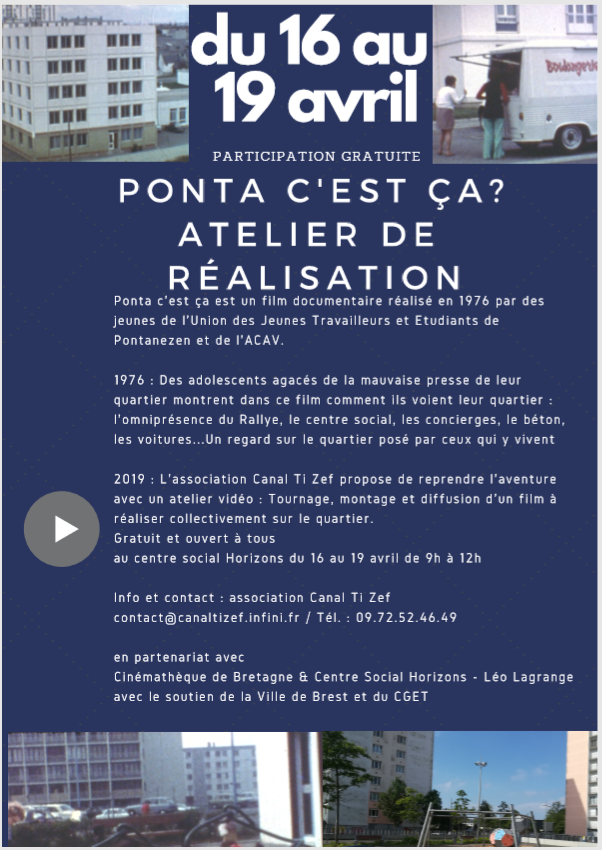 Suite aux projections du film « Ponta c’est ça ? » réalisé en 1976, venez participer à un atelier vidéo au Centre Social Horizons, du 16 au 19 avril de 9h à 12h. Cet atelier est proposé par l’association Canal Ti Zef, en partenariat avec la cinémathèque de Bretagne et le Centre Social Horizons – Léo Lagrange, avec le soutien de la Ville de Brest et du CGET.
