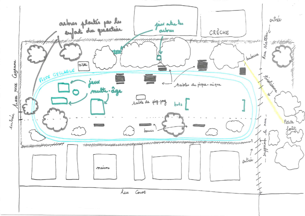 Le projet consiste en la création d’un lieu pour sortir en famille avec des jeux pour tous les âges, concentrés au même endroit et à l’ombre sous des arbres. Ainsi les habitant.es du quartier auront accès à un espace pour profiter de l’extérieur, se rencontrer, partager des moments avec les enfants.
