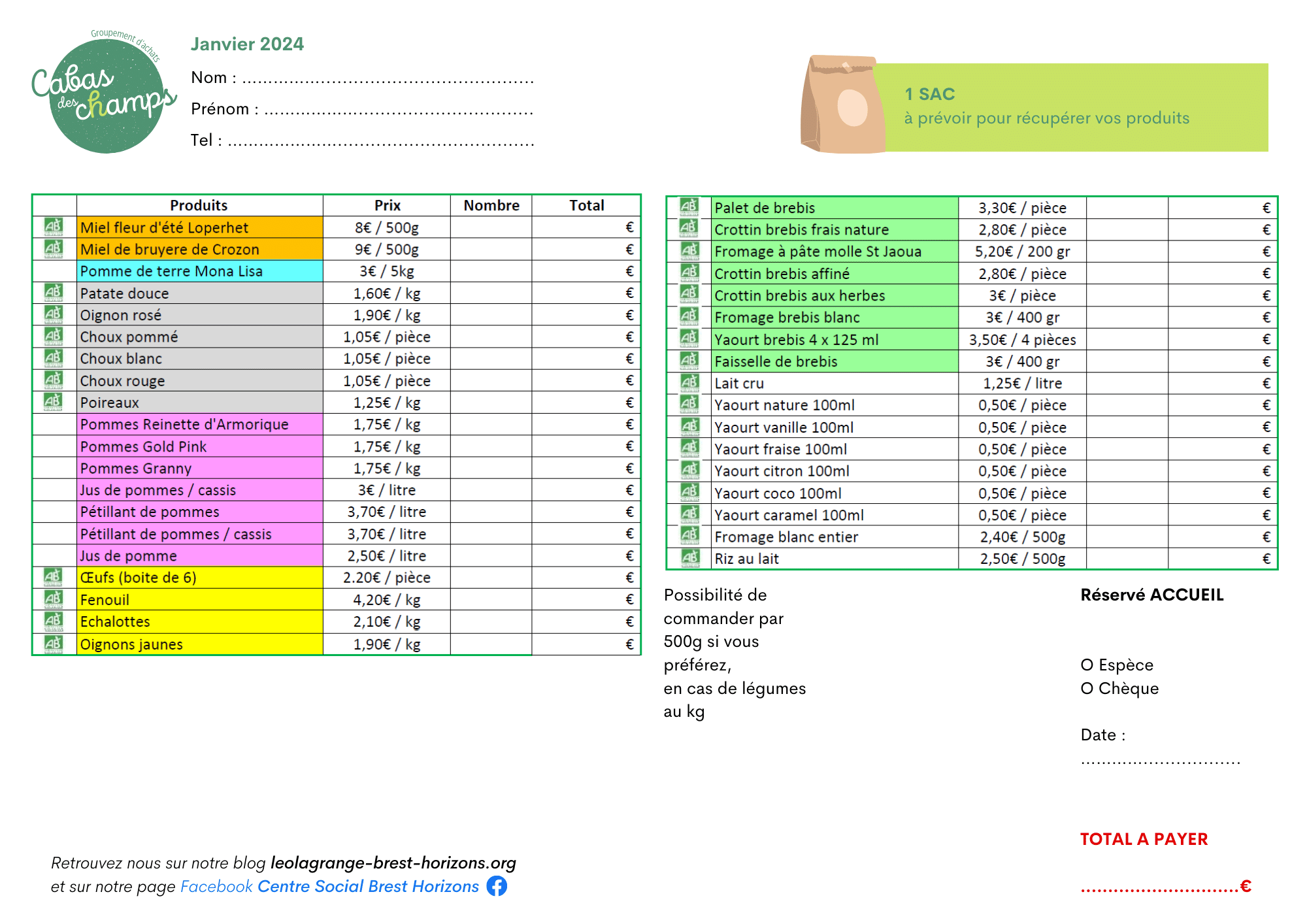 Vous trouverez les bons de commande à imprimer et remplir ci-dessous, ou directement sur place au Centre Social : Cabas – Janvier – 24