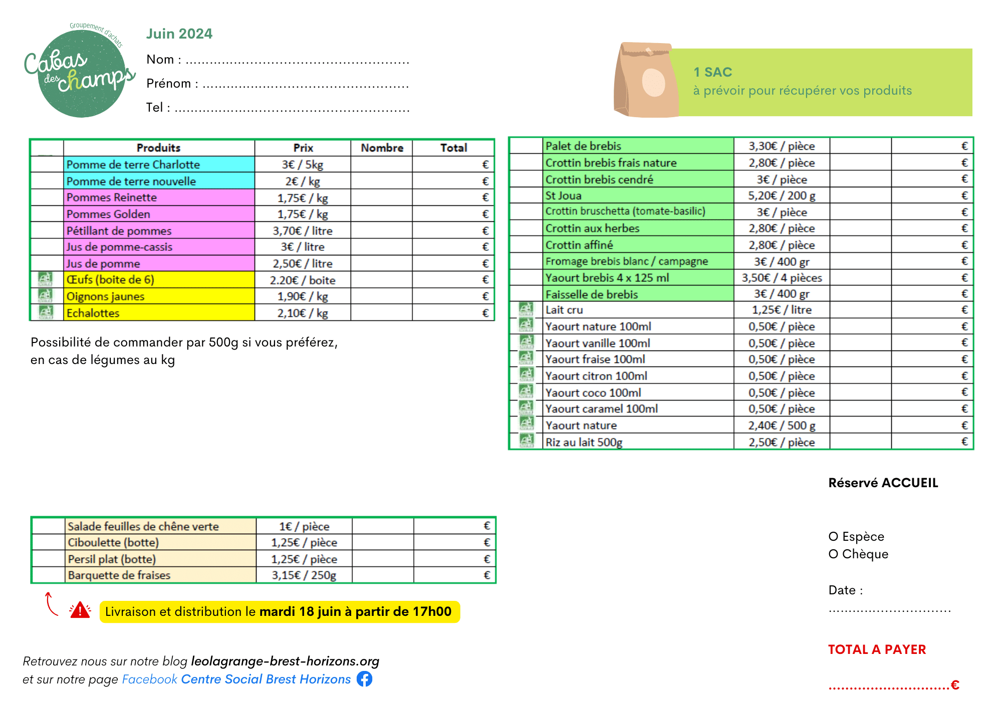 Vous trouverez les bons de commande à imprimer et remplir ci-dessous, ou directement sur place au Centre Social : Cabas – Juin – 24