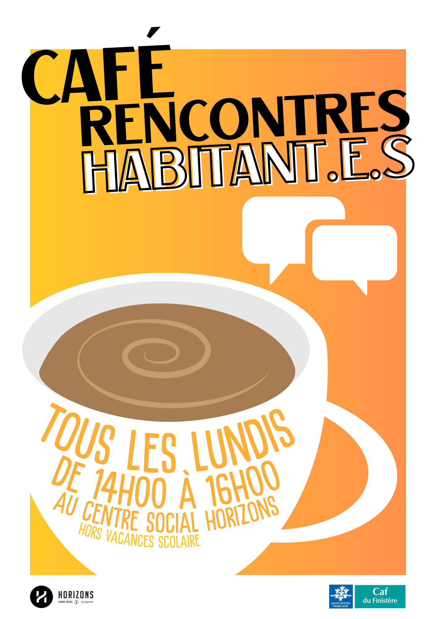 Café rencontres habitant.e.s : tous les lundis au Centre social Publication publiée :10 novembre 2023 Post category:A l'affiche / Pontanezen / Projets À partir de lundi 13 novembre 2023, le Centre social propose aux habitantes et aux habitants du quartier de se rencontrer et discuter autour d’un café, tous les lundis de 14h à 16h ! Étiquettes: brest, discussion, pontanézen Read more articles Article précédentLes Mercredis Arc en ciel – Novembre 2023 – Parents/enfants Article suivantSortie habitant.e.s : soirée restau et ciné le vendredi 24 novembre 2023