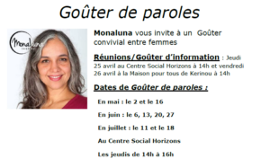 Monaluna vous invite à un Goûter convivial entre femmes Réunions/Goûter d’information : Jeudi 25 avril au…