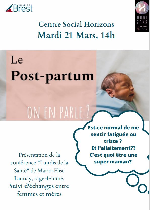 Le Centre social Horizons accueillera en son sein une conférence de Marie-Elise Launey, sage-femme,  portant sur le Post-partum le mardi 21 mars 2023 à 14h.