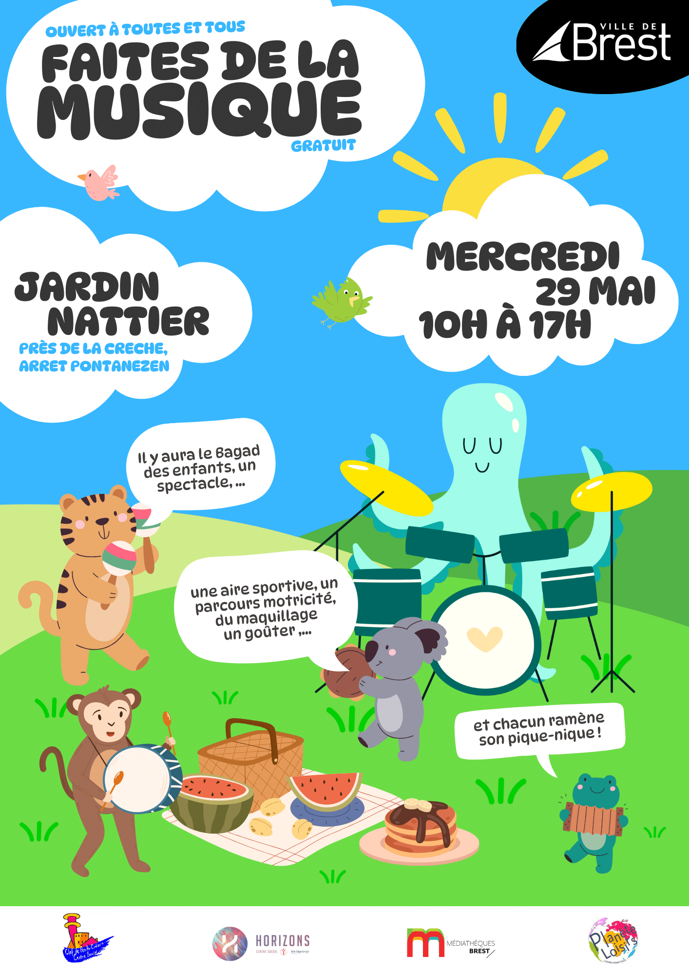 À partir de 10h sur l’espace vert près de la crèche (arrêt Pontanezen), il vous sera possible d’apprécier la Batucada des enfants et de voir un spectacle, vos enfants pourront également se maquiller, profiter d’une aire sportive …