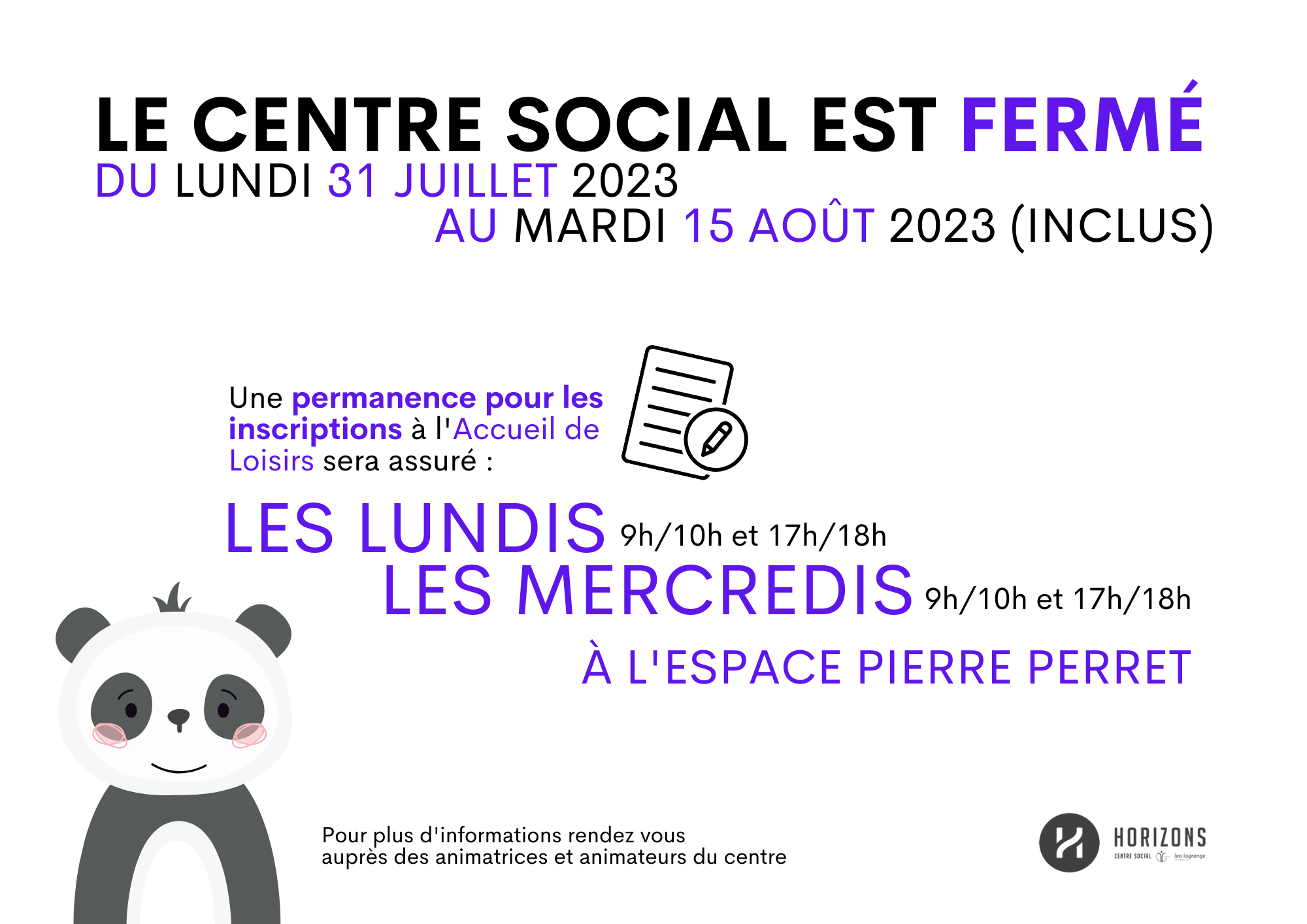 Le Centre social étant fermé du lundi 31 juillet 2023 au mardi 15 août 2023 (inclus), des permanences d’inscription à l’Accueil de loisirs auront lieu les lundis et les mercredis de 9h à 10h, puis de 17h à 18h à l’espace Pierre Perret.