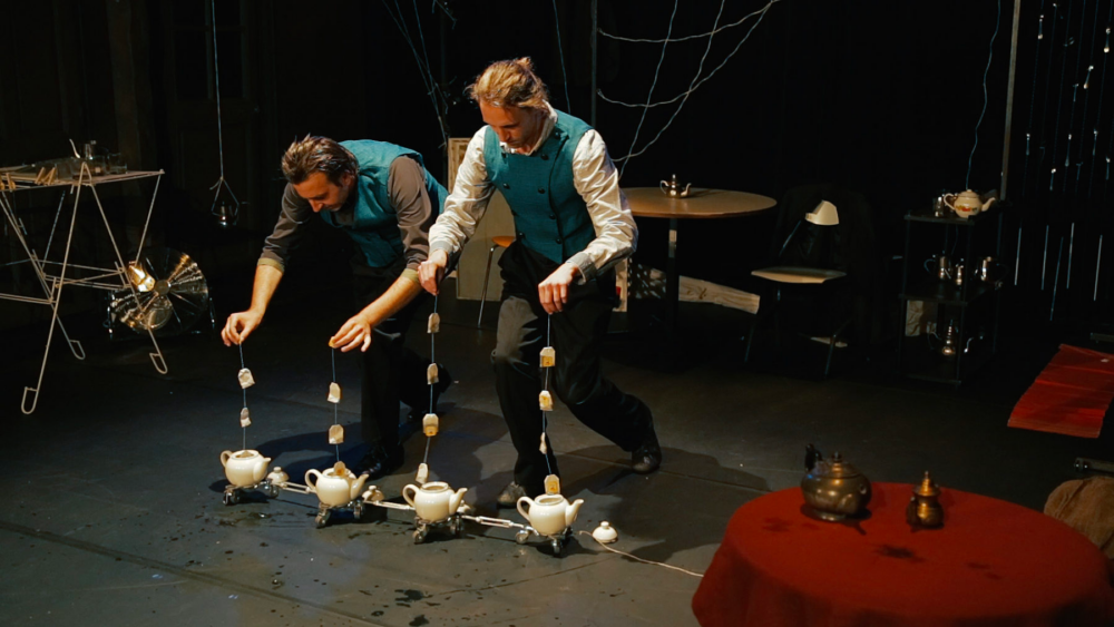 Entre art du cirque et théâtre d’objets, Baraka est un spectacle tendre et malicieux dans lequel deux personnages, tels des Barmen désœuvrés s’invitent à des jeux absurdes esthétiques ou comiques, virtuoses ou simplistes. Dans la pure tradition du burlesque, et au rythme qu’impose le genre, ils détournent les objets de leurs usages premiers, font voler les théières et danser les verres, mettent les sucres en lévitation dans des chorégraphies mécaniques, font onduler les sachets de thé comme le joueur de flûte fait lever le serpent… – Festival OUPS !