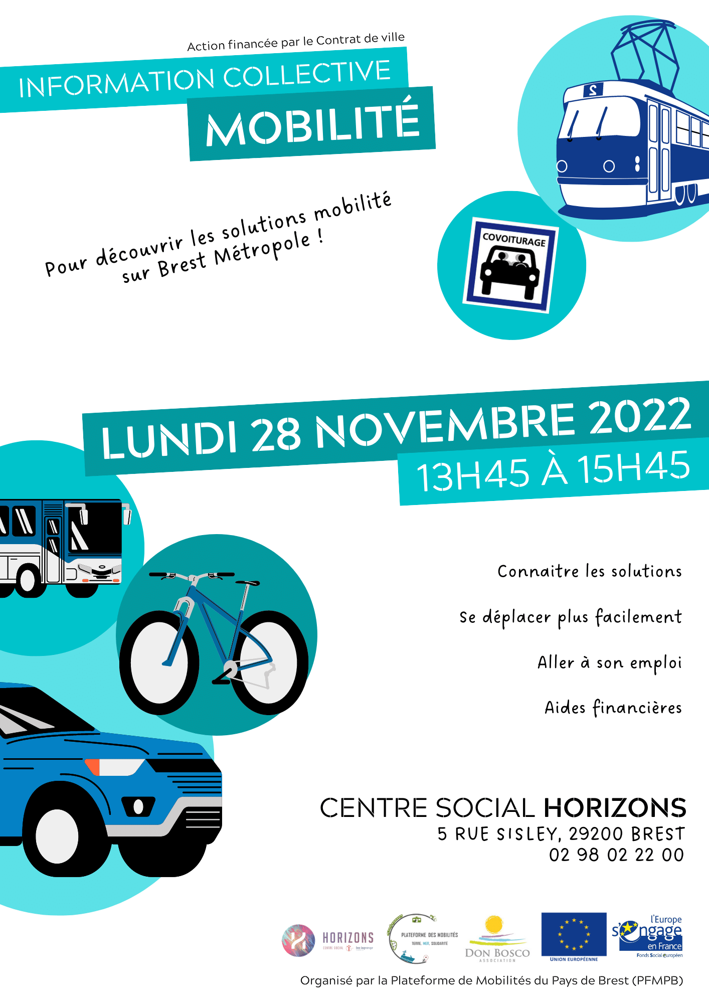 Une information collective, financée par le Contrat de ville et organisée par la Plateforme de Mobilités du pays de Brest (PFMPB) aura lieu le lundi 28 novembre à 13h45 au Centre social, avec pour objectif de faire découvrir les solutions mobilité sur Brest et sa Métropole.