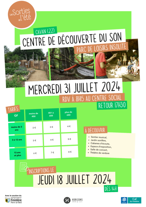 Rendez-vous à 8h15 devant le Centre social pour un départ vers Cavan dans les Cotes d’Armor afin de visiter le Centre de découverte du Son. À découvrir sur place : un sentier musical, le jardin sonifère, des cabanes d’écoute et plein d’autres surprises !