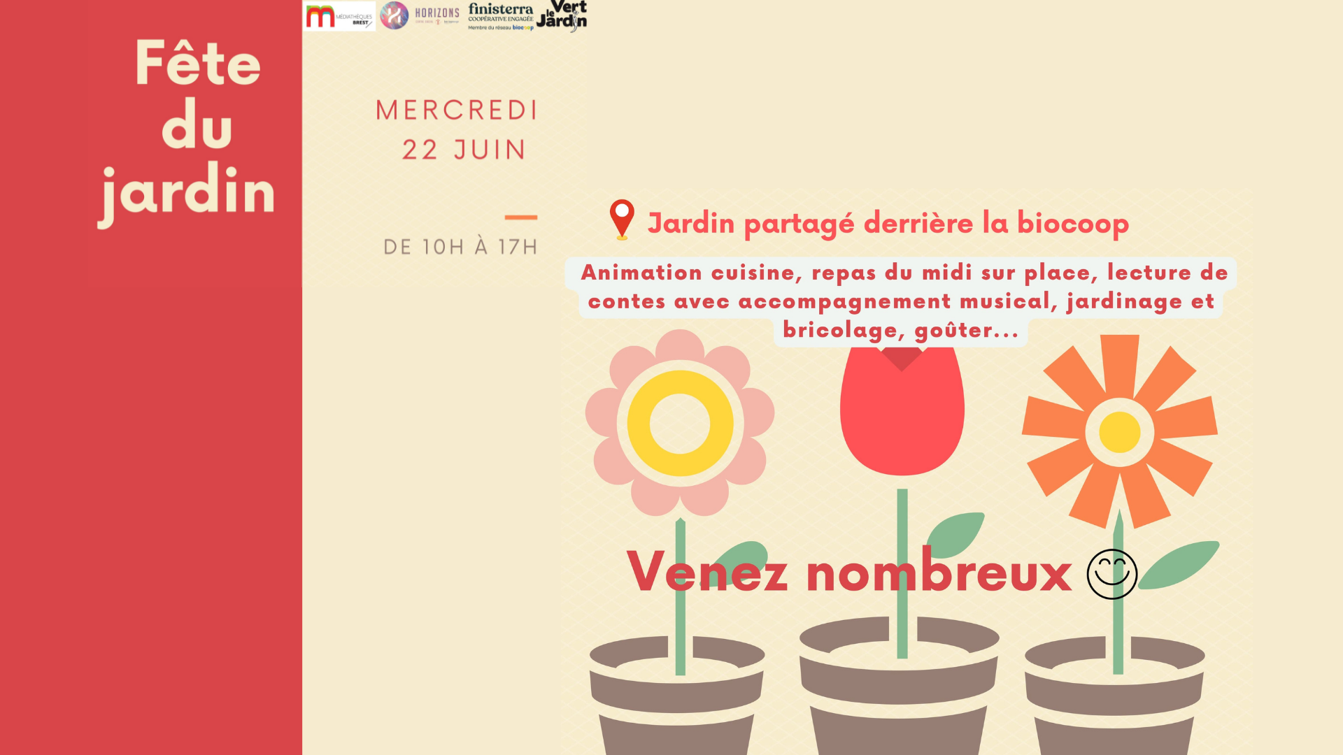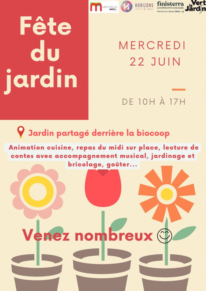 Organisée par Vert le jardin, en coopération et avec Finisterra et les médiathèques de Brest, c’est la fête du jardin sur le terrain derrière la Biocoop, mercredi de 10h à 17h !