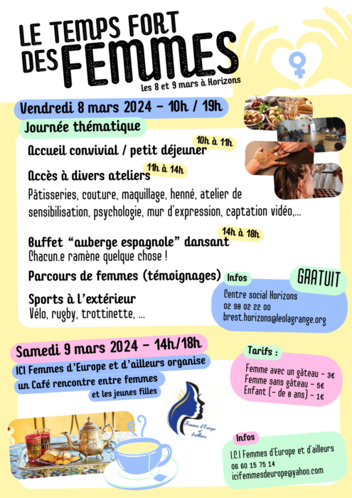 À l’occasion de la journée internationale des droits des femmes, le Centre social Horizons et l’association « I.C.I Femmes d’Europe et d’ailleurs » proposent le Temps fort des femmes qui s’articule en deux temps : une journée thématique le vendredi 8 mars de 10h à 19h et un Café rencontre le samedi 9 mars de 14h à 18h !