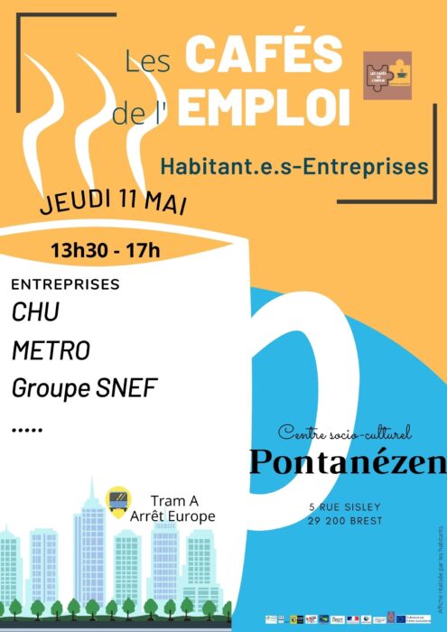 Désormais un incontournable des rencontres entres candidats et entreprises, les Cafés de l’emploi permettent de mettre en lien, autour d’un café, les habitant.e.s d’un territoire spécifique et des employeurs cherchant à recruter. Parmi les entreprises confirmées, on retrouve entre autres : le CHU de Brest, le groupe industriel SNEF ou encore le grossiste alimentaire et matériel METRO.