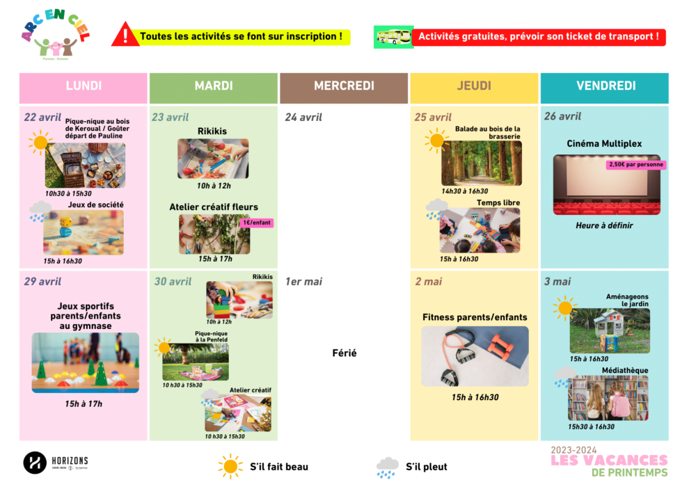 Les vacances Arc en ciel – Printemps 2024 – Parents/enfants Publication publiée :15 avril 2024 Post category:A l'affiche / Famille / Pontanezen / Vacances Dernières vacances avant la fin de l’année scolaire, découvrez ci-dessous les activités proposées par le secteur famille pour cette période : Étiquettes: brest, famille, pontanézen, vacances Read more articles Article précédentSortie habitant.e.s : soirée restau et ciné le vendredi 19 avril 2024 Article suivantGrand goûter des vacances ! (préparation de l’été du secteur famille)