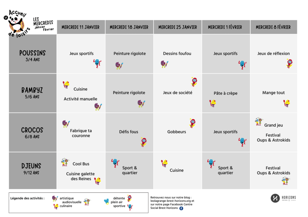 Planning des mercredis (du 11 janvier au 8 février 2023) – Enfance (3/12 ans) Publication publiée :9 janvier 2023 Post category:A l'affiche / Enfance / Mercredi / Pontanezen Ci-dessous, le premier planning de 2023 pour l’Accueil de Loisirs ! Un programme qui sera ,entre autres, riche en activités manuelles et en sport. À cela s’ajoute des participations au Coolbus de la Carène, au festival Oups et à Astrokids. Étiquettes: accueil de loisirs, brest, enfants, mercredi, pontanézen Read more articles Article précédentCabas des champs et Vrac 29 – Janvier 2023 Article suivantPlanning des mercredis (du 11 janvier au 8 février 2023) – Jeunesse 11/17 ans