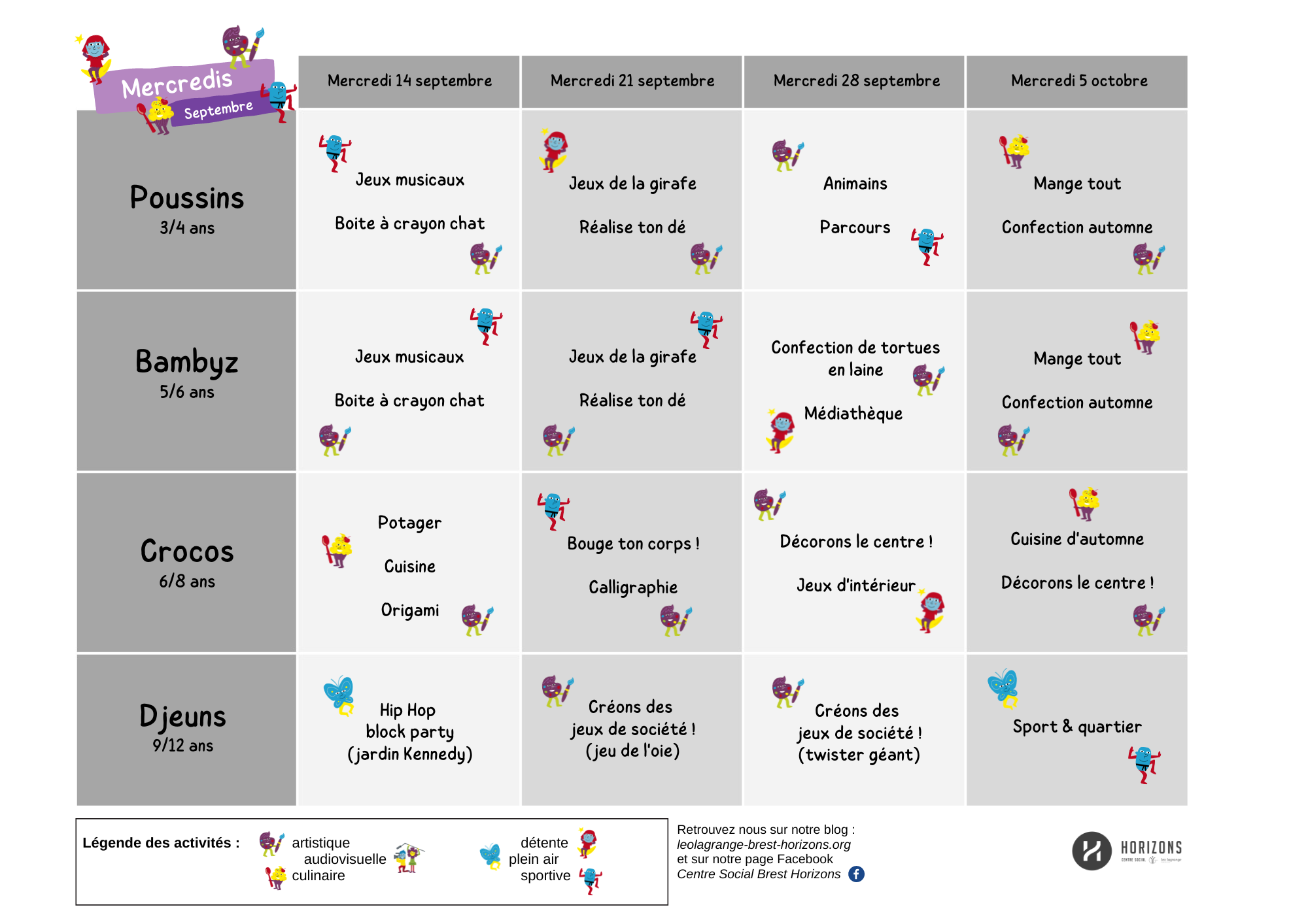 Planning des mercredis (du 14 sept au 5 oct 2022) – Enfance (3/12 ans)