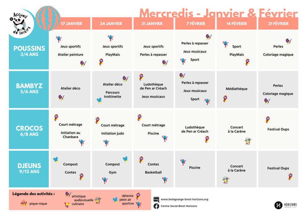 En attendant les vacances de février qui vont arriver très vite, l’Accueil de loisirs vous propose de découvrir les activités prévues pour les mercredis de Janvier et Février.