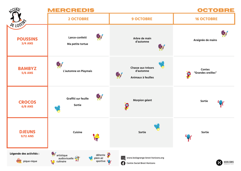 À quelques semaines des vacances d’automne, les activités proposées pour les 3 mercredis après-midi à venir sont à découvrir ci-dessous :