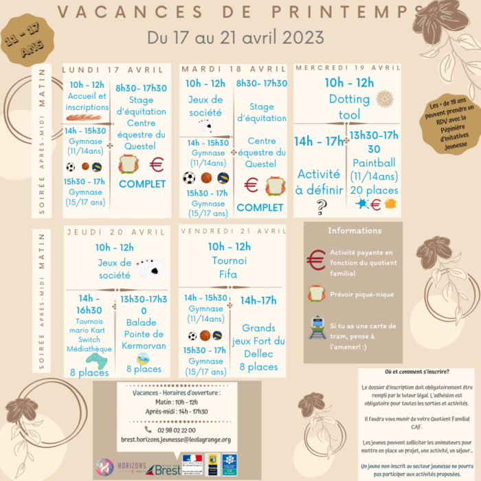 Planning des vacances de printemps – Activités Jeunesse (11/17 ans) Publication publiée :18 avril 2023 Post category:A l'affiche / Jeunesse / Pontanezen / Vacances Équitation, paintball, piscine, casino, balade, … à découvrir ci-dessous, le programme des vacances de printemps pour les 11/17 ans du Centre social ! Étiquettes: brest, jeunesse, pontanézen, vacances Read more articles Article précédentPlanning des vacances de printemps – Enfance (3/12 ans) Article suivantExposition « Glisse libre » dans notre vitrine pour les 90 ans d’APF France handicap