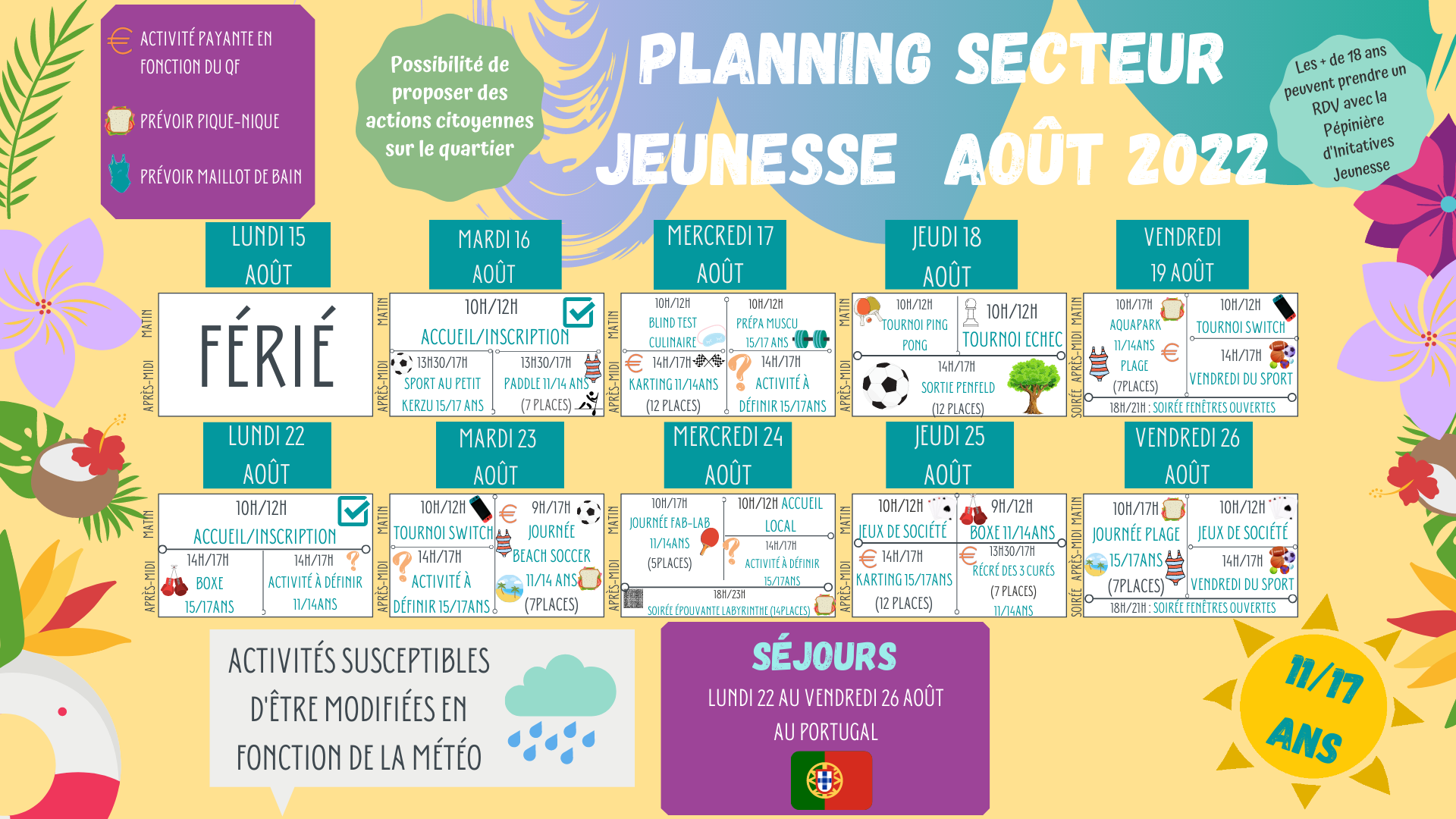 À découvrir ci-dessous, le planning d’activités du secteur jeunesse pour les mois de Juillet et d’Août 2022 !