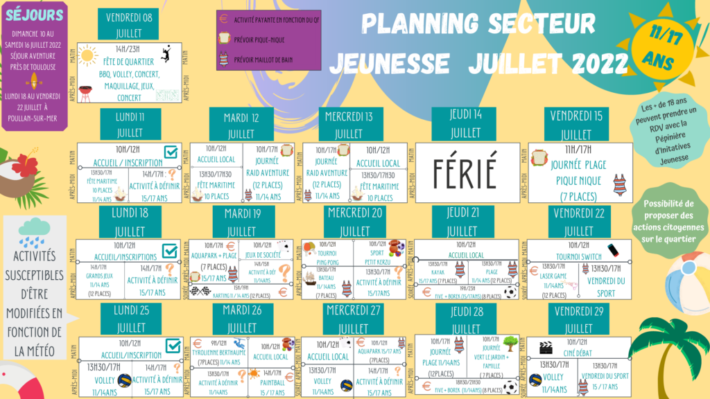 À noter que le secteur sera fermé les deux premières semaines d’août, que certaines activités sont payantes en fonction du QF alors que d’autres nécessitent de prévoir un pique-nique ou un maillot de bain (voir les pictogrammes).