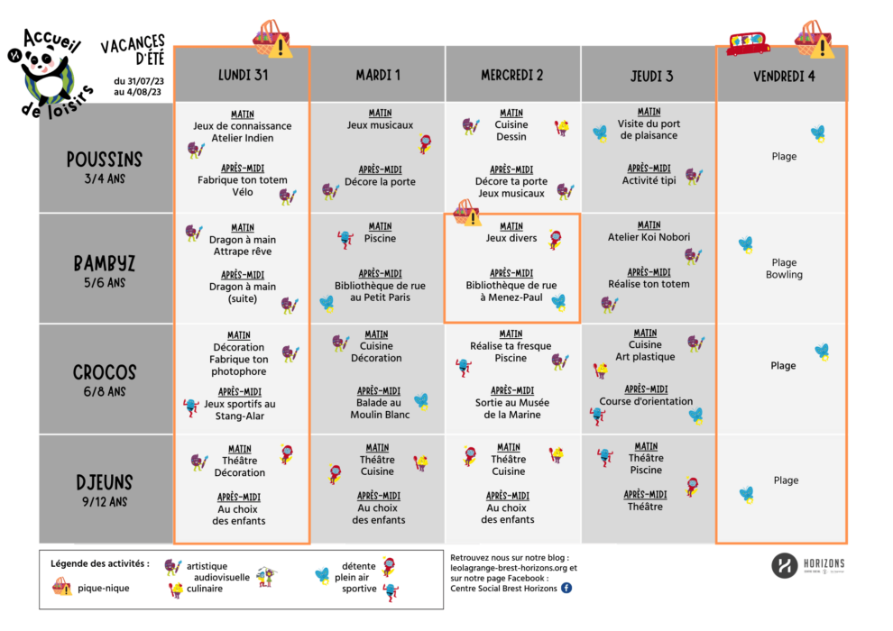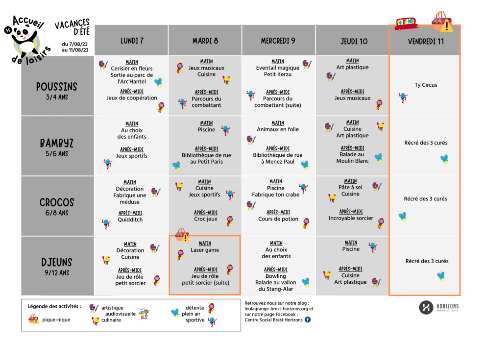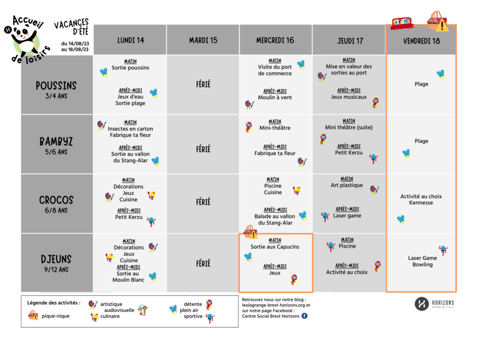 Planning des vacances d’été – Août – Enfance (3/12 ans) Publication publiée :13 juillet 2023 Post category:A l'affiche / Enfance / Pontanezen / Vacances Le programme de ce mois d’août est à découvrir, semaine par semaine, ci-dessous. Semaine du 31 juillet au 4 août : Semaine du 7 au 11 août : Semaine du 14 au 18 août : Étiquettes: accueil de loisirs, brest, enfants, pontanézen, vacances Read more articles Article précédentStages équitation du secteur jeunesse au Questel Article suivantAppel aux dons : ton déchet est mon trésor