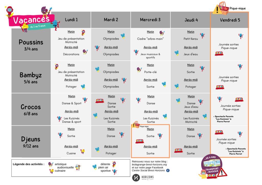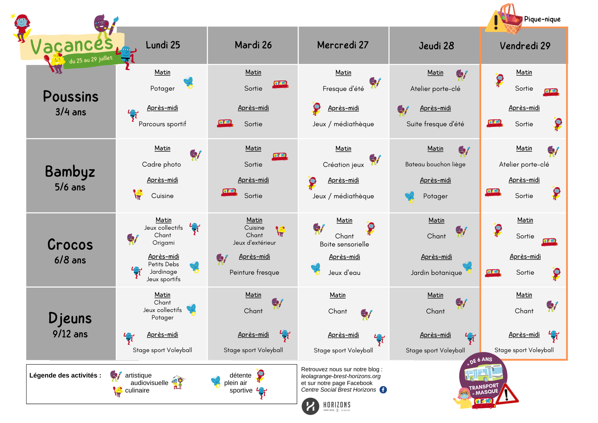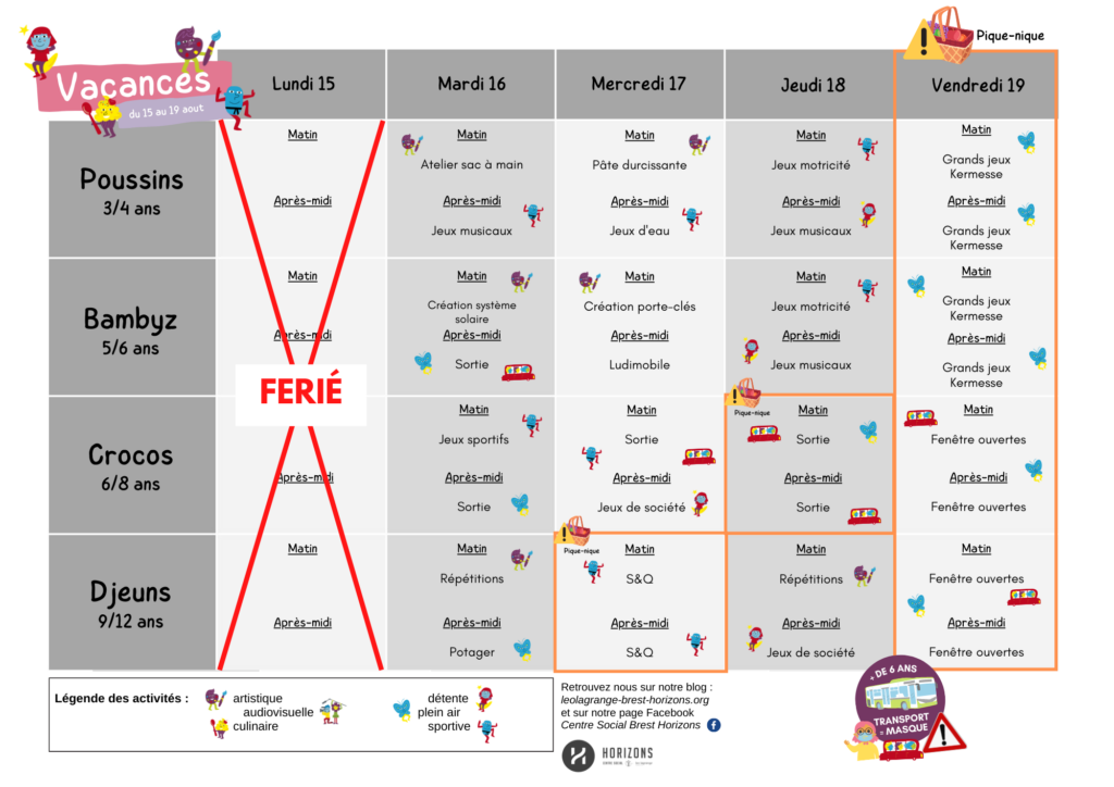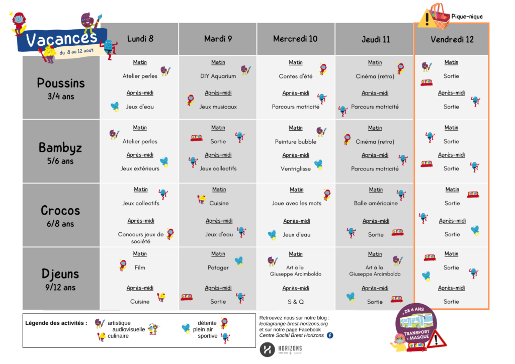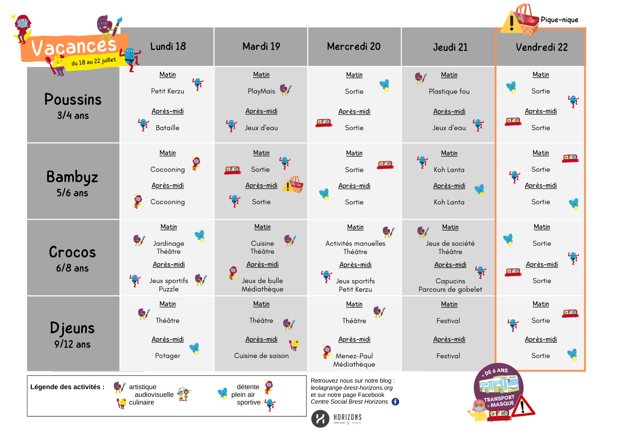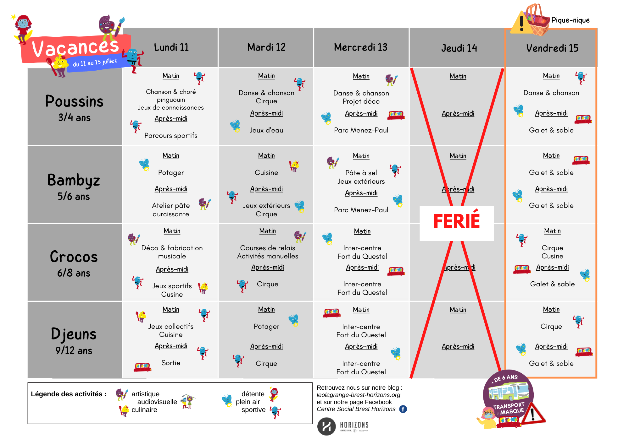 Ouvert sur la période allant du vendredi 8 juillet au vendredi 19 août 2022 , vous pouvez dès à présent retrouver les plannings du Lundi 11 juillet au Vendredi 12 août 2022 (le planning de la dernière semaine des vacances allant du 16/08/22 au 19/08/22 arrive très vite).