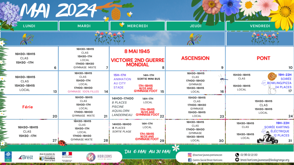Planning mois de mai – Activités Jeunesse (11/17 ans) Publication publiée :14 mai 2024 Post category:A l'affiche / Jeunesse / Mercredi Ci-dessous, le planning des activités jeunesse (11/17 ans) pour le mois de mai : Étiquettes: brest, jeunesse, mercredi, pontanézen Read more articles Article précédentCabas des champs – Mai 2024 Article suivantFaites de la musique le mercredi 29 mai au jardin Nattier