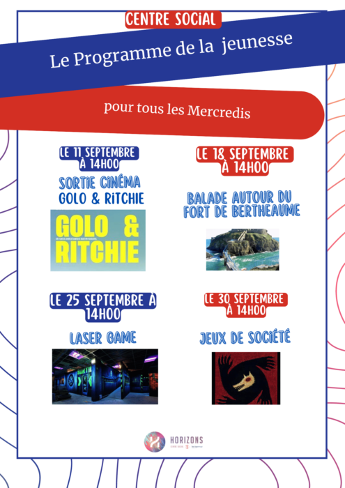 Planning mois de septembre – Activités Jeunesse (11/17 ans) Publication publiée :11 septembre 2024 Post category:A l'affiche / Jeunesse / Mercredi / Pontanezen Ci-dessous, le planning des activités jeunesse (11/17 ans) pour le mois de septembre : Étiquettes: brest, jeunesse, mercredi, pontanézen Read more articles Article précédentPlanning des mercredis – Septembre – Enfance (3/12 ans) Article suivantLes Mercredis Arc en ciel – Octobre 2024 – Parents/enfants