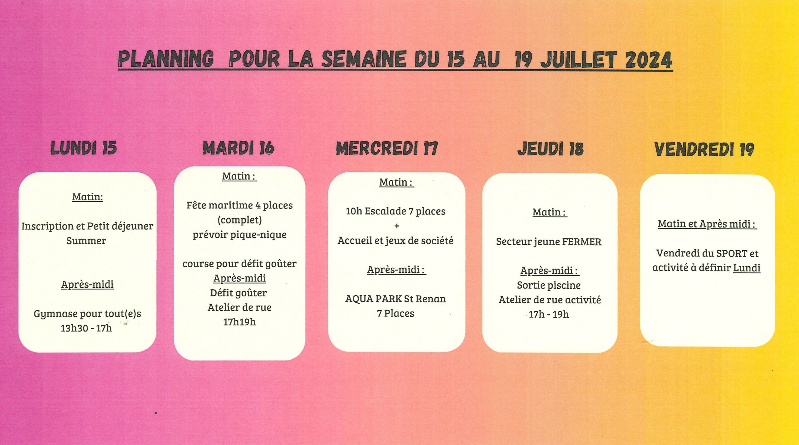 Planning vacances d’été – 15 au 19 juillet – Activités Jeunesse (11/17 ans) Publication publiée :15 juillet 2024 Post category:A l'affiche / Jeunesse / Pontanezen / Vacances Ci-dessous, le planning des activités jeunesse (11/17 ans) pour la semaine du 15 au 19 juillet 2024 : Étiquettes: brest, jeunesse, pontanézen, vacances Read more articles Article précédentInscriptions à la sortie famille au Centre de découverte du son Article suivantDébut du chantier peinture pour la future épicerie solidaire de Pontanézen