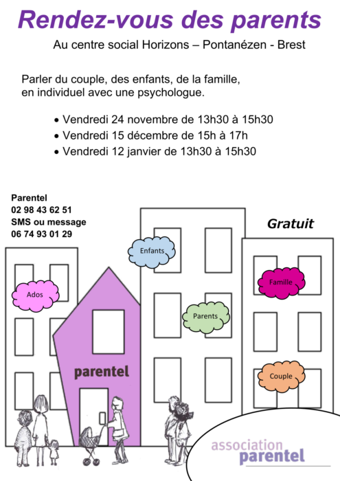 Au programme, des moments d’échange sur le thème de la famille : qu’il s’agisse du couple, des enfants, de la fratrie, du handicap ou encore du deuil, l’association Parentel propose aux personnes qui en ressentent le besoin des rendez-vous en individuel avec une psychologue.
