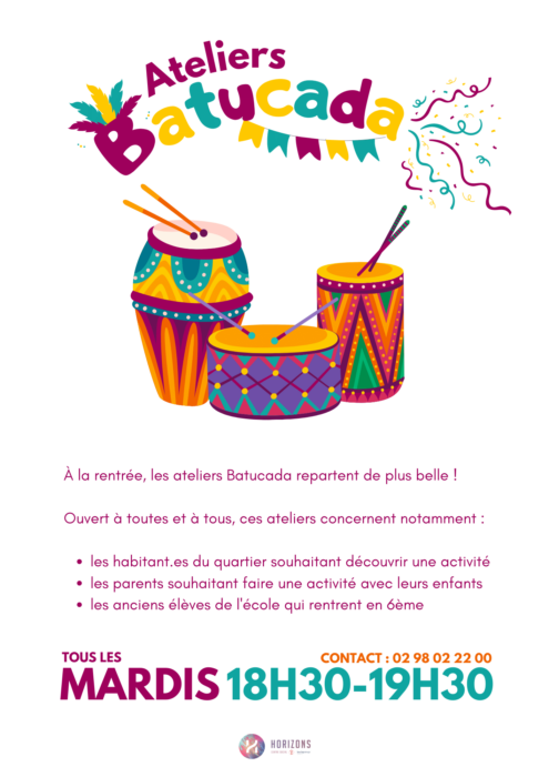 Reprise des ateliers Batucada du mardi ! Publication publiée :15 septembre 2023 Post category:A l'affiche / Enfance / Famille / Pontanezen La Batucada, style musical de percussions venu tout droit du Brésil, reprend au Centre social Horizons ! Ces ateliers gratuits sont ouverts à toutes et tous, petits comme grand : Étiquettes: brest, enfants, famille, musique, pontanézen Read more articles Article précédentAteliers Couture & Tricot à Horizons Article suivantPlanning des mercredis – Activités Jeunesse (11/17 ans)