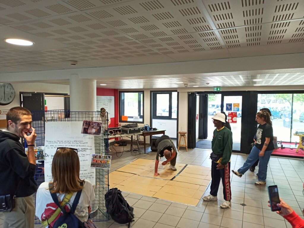À l’occasion du vernissage, un DJ de l’association The Room, des danseurs de breakdance du crew* « La Fierté des Nôtres » et ZHPS, un rappeur brestois, sont venus animer le Centre Social et partager un moment de convivialité avec des passants, des habitants du quartier et des amateurs de culture hip-hop.