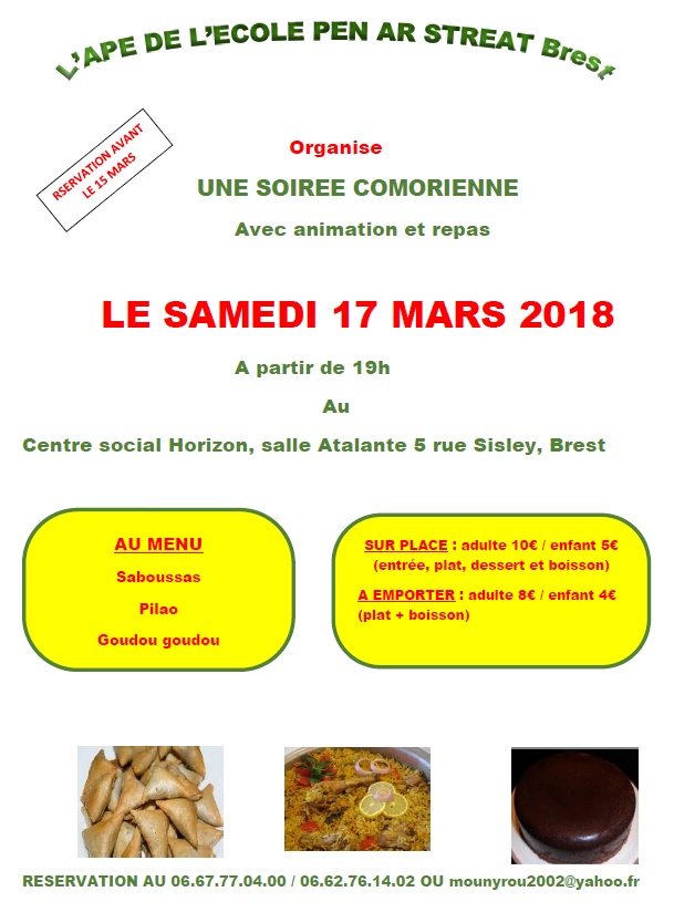 L’Association de Parents d’Elèves de l’école Pen ar streat organise une soirée comorienne (avec animations et repas) le Samedi 17 mars à partir de 19h, salle Atalante, Centre Social Horizons.